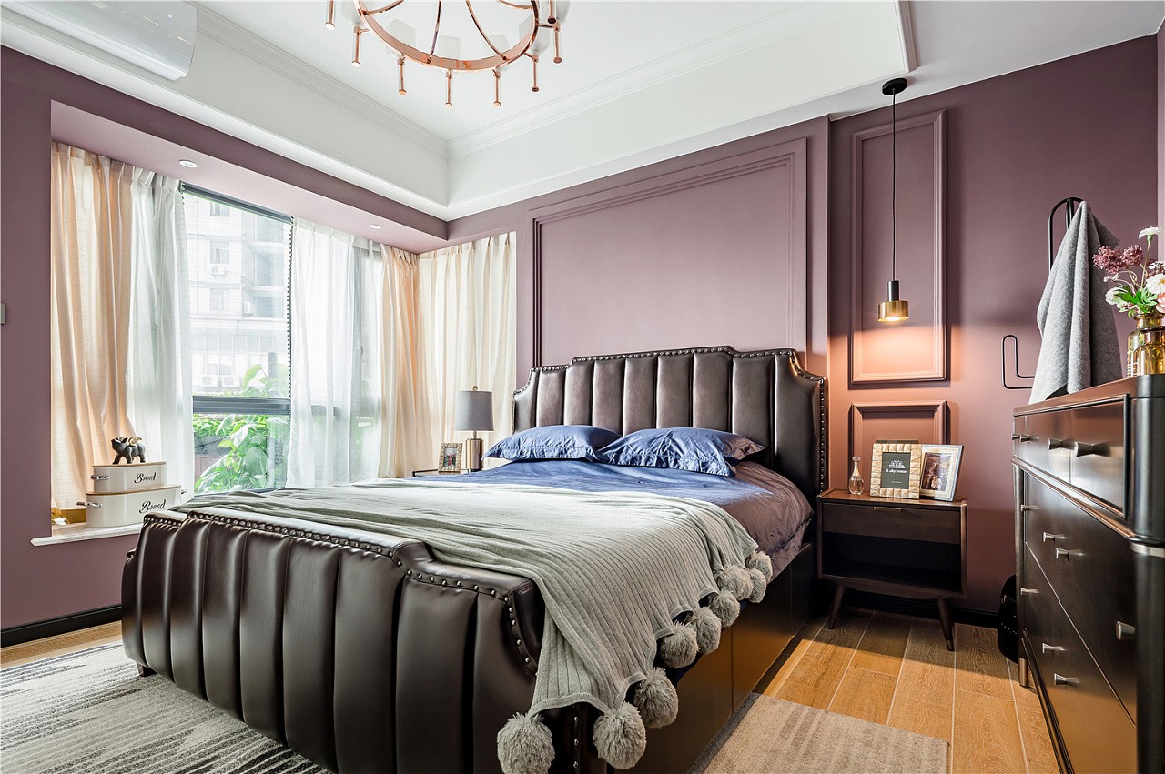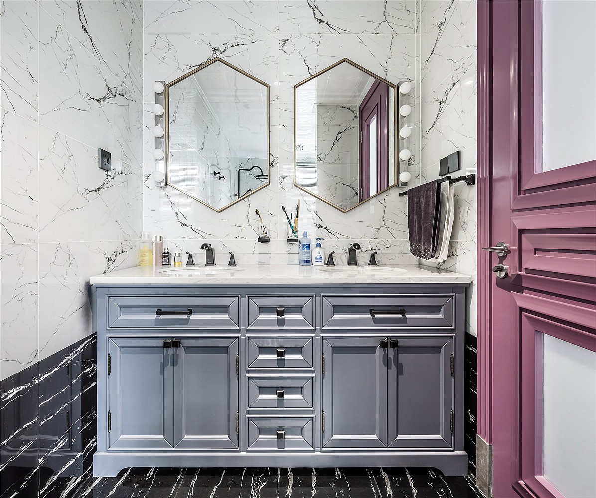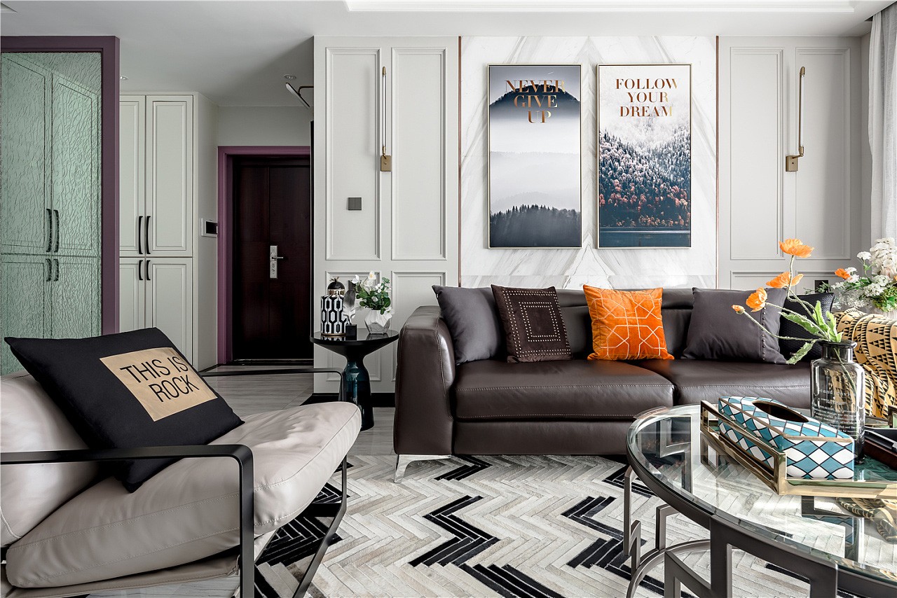 入戶門廳以白色作為基調(diào),紫色門套作為點(diǎn)綴,整體空間驚艷脫俗。地板選用更易清洗、更耐磨損的全瓷磚鋪設(shè),大理石貼墻與地面一起,把客餐廳的整體基調(diào)定在了一個雅字上,典雅大氣。深色的皮質(zhì)沙發(fā)把整個客廳的冷色調(diào)提了起來,像一杯香醇的咖啡,迅速捂暖了大理石的冷硬。主臥室淺棕色、黑色、紫色、白色,四大色塊干凈利落的劃分出主臥的空間層次,床頭細(xì)節(jié)的處理使空間更有縱深感。主衛(wèi)生間銀白龍和爵士白的采用與客廳的整體色調(diào)一脈相承,三種切割成不同大小的瓷磚拼接造型,使小小一方天地也能層次分明。