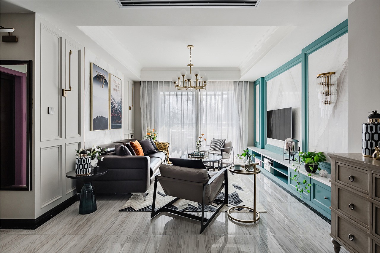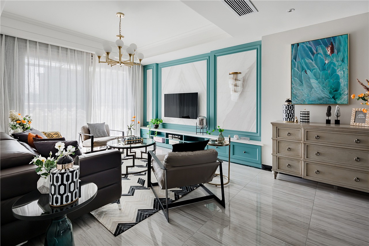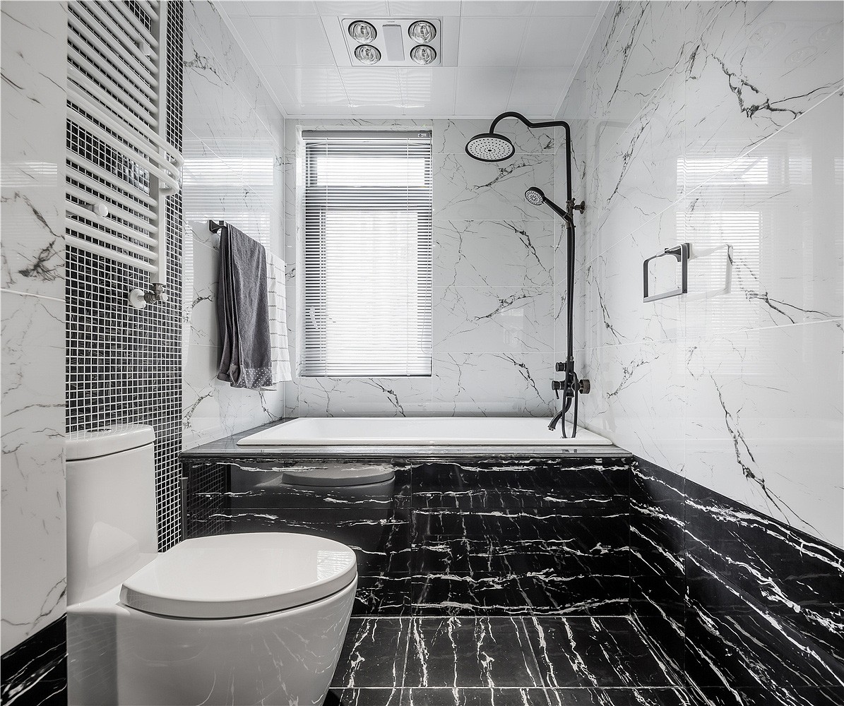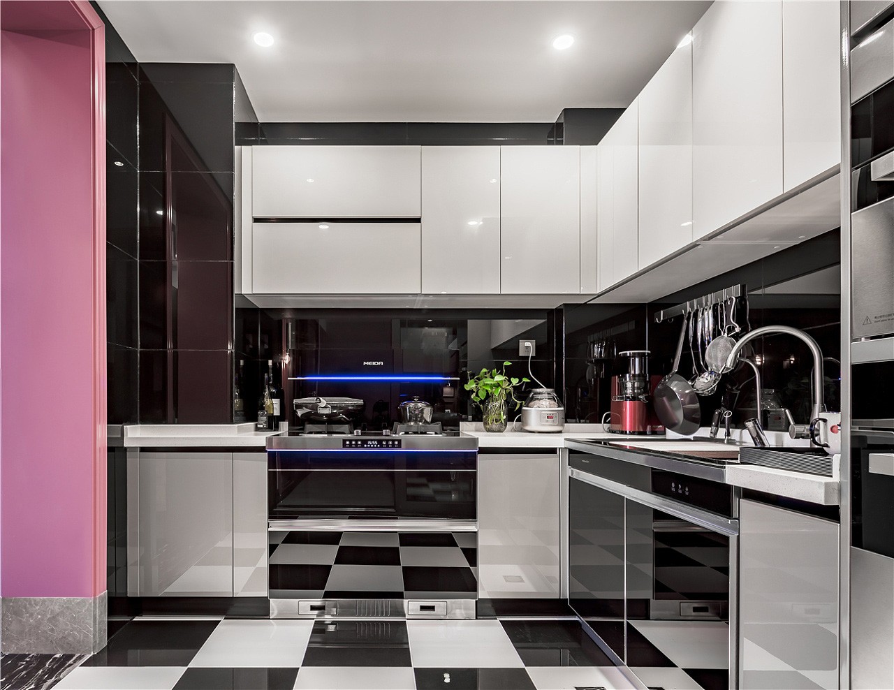 入戶門廳以白色作為基調(diào),紫色門套作為點(diǎn)綴,整體空間驚艷脫俗。地板選用更易清洗、更耐磨損的全瓷磚鋪設(shè),大理石貼墻與地面一起,把客餐廳的整體基調(diào)定在了一個雅字上,典雅大氣。深色的皮質(zhì)沙發(fā)把整個客廳的冷色調(diào)提了起來,像一杯香醇的咖啡,迅速捂暖了大理石的冷硬。主臥室淺棕色、黑色、紫色、白色,四大色塊干凈利落的劃分出主臥的空間層次,床頭細(xì)節(jié)的處理使空間更有縱深感。主衛(wèi)生間銀白龍和爵士白的采用與客廳的整體色調(diào)一脈相承,三種切割成不同大小的瓷磚拼接造型,使小小一方天地也能層次分明。