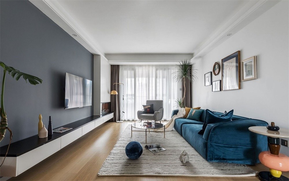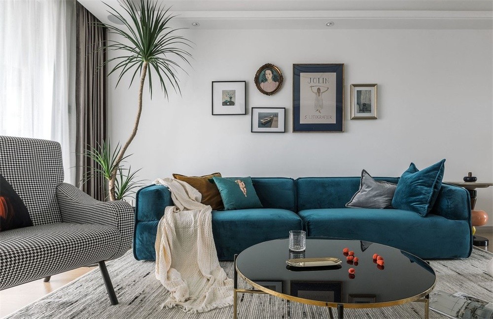絲絨質感的沙發搭配金屬角的玻璃茶幾,造型別致的糖葫蘆角幾、有趣的抱枕圖案、集實用與美觀于一體的電視柜有了壁爐的襯托讓客廳空間加分,營造出一個愜意輕松的生活氛圍,既混搭又精致。