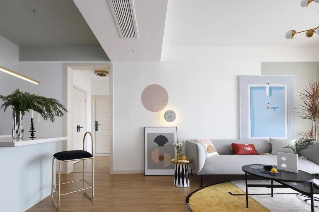 沙發(fā)墻潔凈的墻面加入白色與灰色的雙色設計,掛放一幅極簡的掛畫,左側還有兩盞圓形的壁燈。灰色布藝沙發(fā),還有鮮艷活
