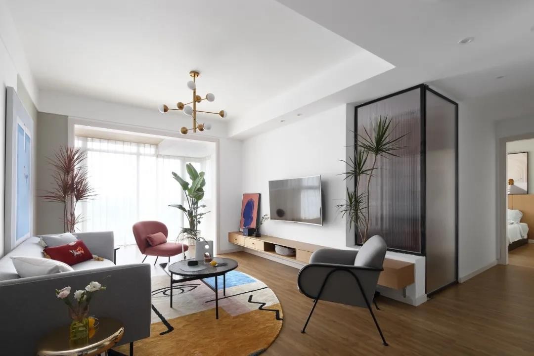 電視墻以懸空的木質(zhì)電視柜+壁掛電視機,電視墻右邊加入長虹玻璃的室內(nèi)隔斷,讓空間的光線得以共享,同時也增加了空間的設計感。