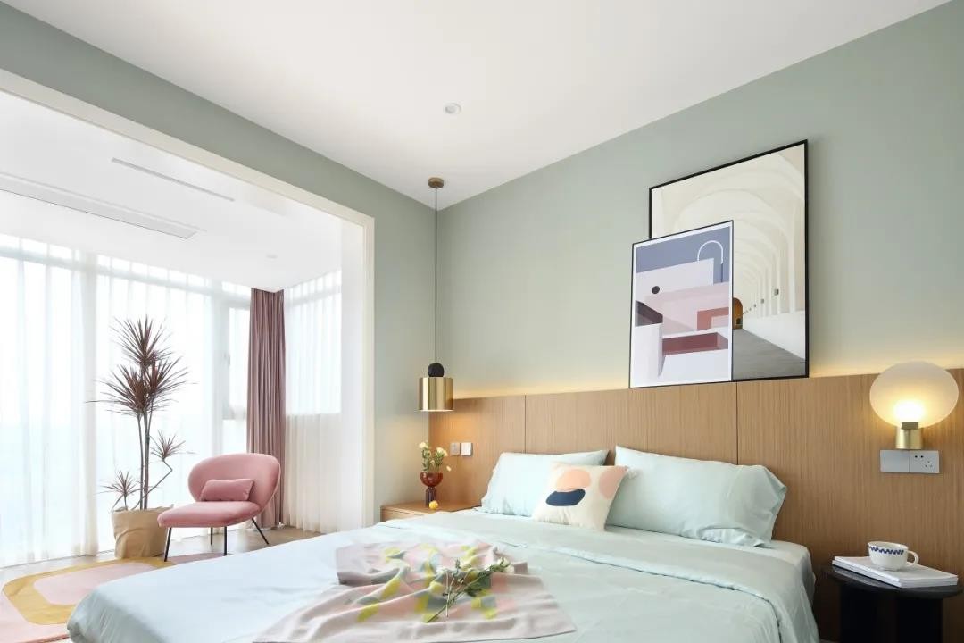 臥室空間整體淡藍色的墻面,床頭墻的墻腳是木飾面的材質(zhì),加入壁燈吊燈與燈帶,布置裝飾畫,簡約自然的床單,讓空間顯得清新優(yōu)雅而文藝。