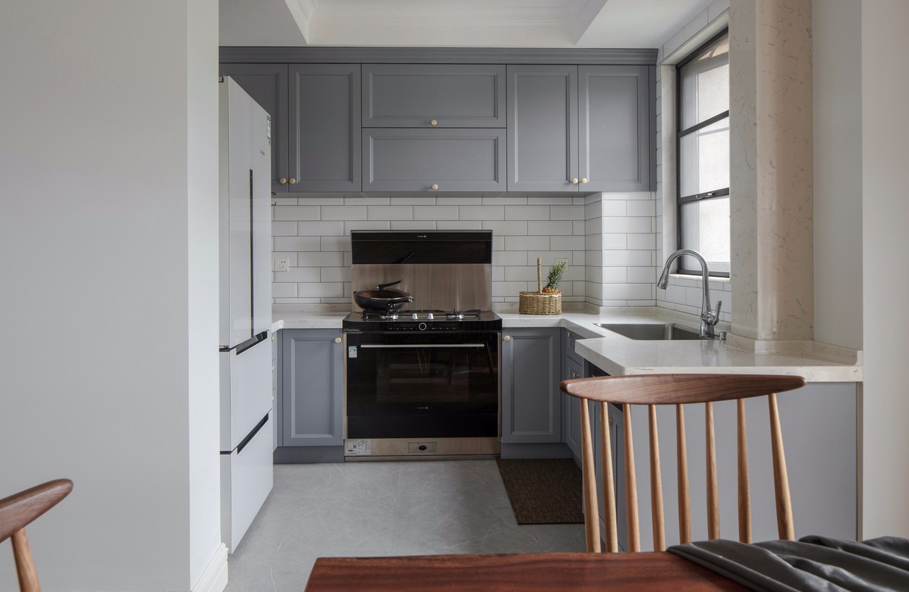 因廚房原來的面積本來就較小,為了改善這個問題,我們還是采用了開放式廚房。整個區(qū)域與餐廳區(qū)域結(jié)合,這里不做區(qū)隔,方便媽媽做菜的時候,可以和餐廳的人進行互動。 當然,開放式廚房,有一個小建議,因為炒菜油煙的問題,建議購買大功率吸油煙機。房東買的集成灶,既節(jié)省空間,也方便使用。因為收納空間足夠,所以平常不使用的時候,臺面也可以保持整潔如新。