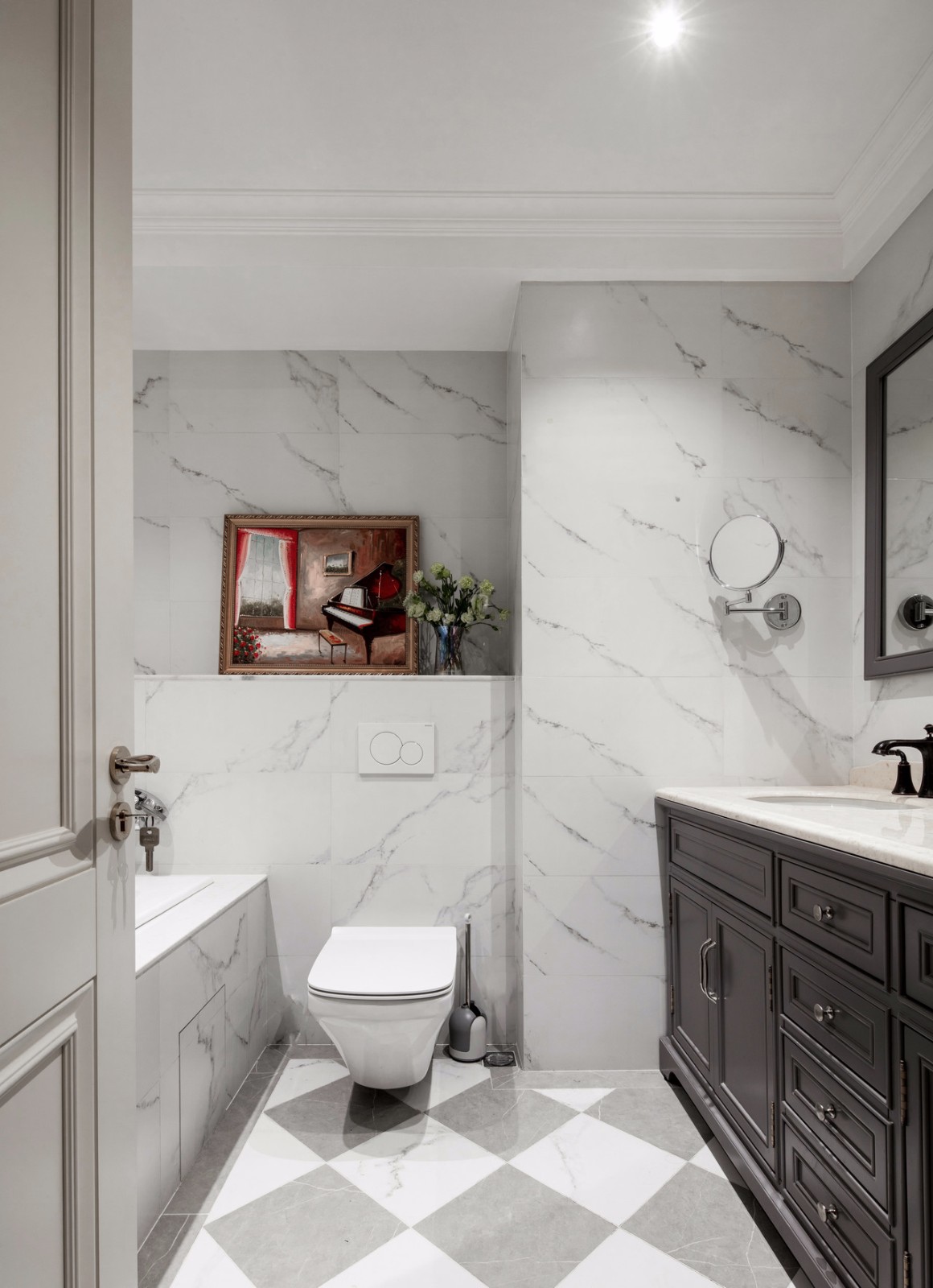 主臥的衛(wèi)生間滿足了房東的要求,浴缸+梳洗臺+儲物柜+馬桶全部都有。因為在主臥,可以滿足泡澡需求而不被打擾,大概牙醫(yī)日常用來放松的場所。 墻面和浴缸表面均采用同樣花紋大理石,不規(guī)則的灰色紋路隨意點綴,任意而妄為;地上的大理石采用菱形灰白大理石,與墻體做呼應。墻上的裝飾畫,我個人很喜歡,使整個使用空間格調(diào)迅速提高。