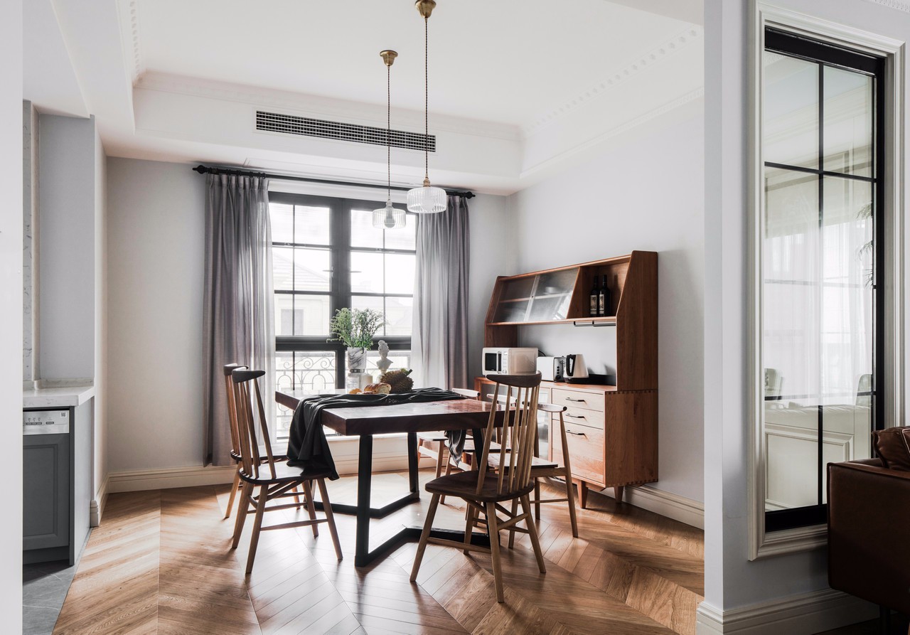 因日常只有三人食用,菜品不會很多,偶爾會有父母做客,滿足房主想要的長行餐桌(正好滿足五人食用,空間不會擁擠) 餐桌后面我又放置了一個儲物柜,色調(diào)與餐桌一致,兼顧了美感和平衡感。可以放置很多廚房放不下的東西(滿足房主喜歡東西擺放整齊的要求)