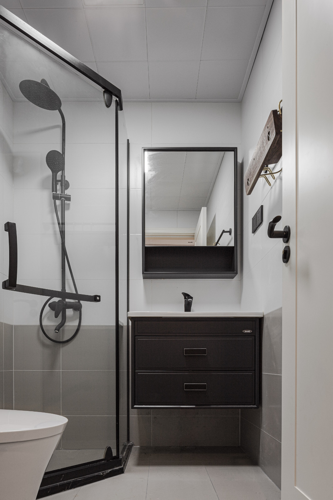 衛生間簡約黑白灰掉,白色+灰色墻面腰線設計,深色簡約臺盆柜加深了空間層次感。