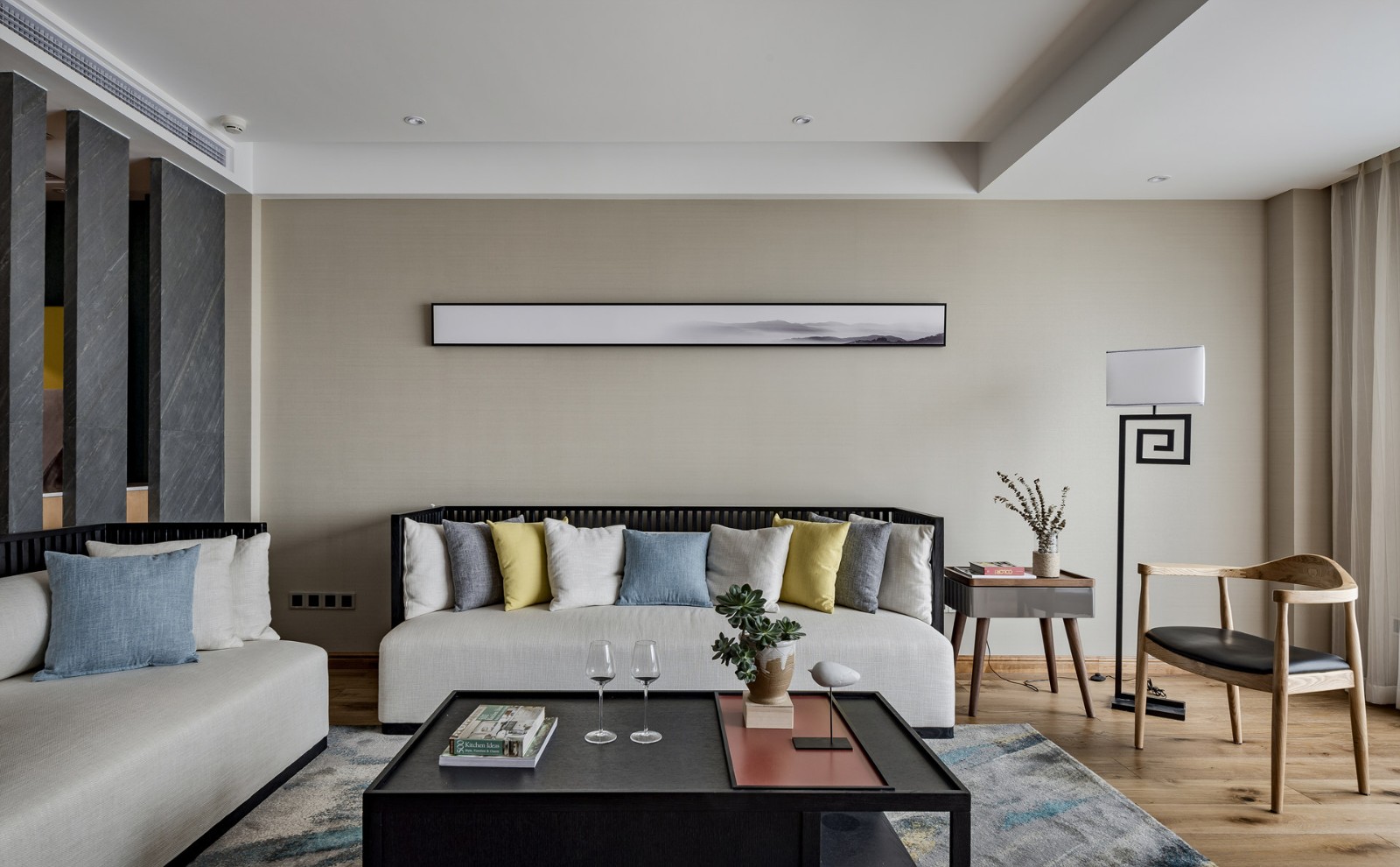 沙發背景墻珍珠白乳膠漆,新中式特有的落地燈,簡單的一副山水掛畫就能體現業主的品味。