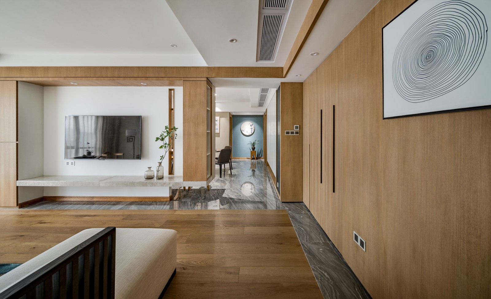 電視背景墻采用原木、大理石、乳膠漆加一點綠植,返璞歸真的生活感受。